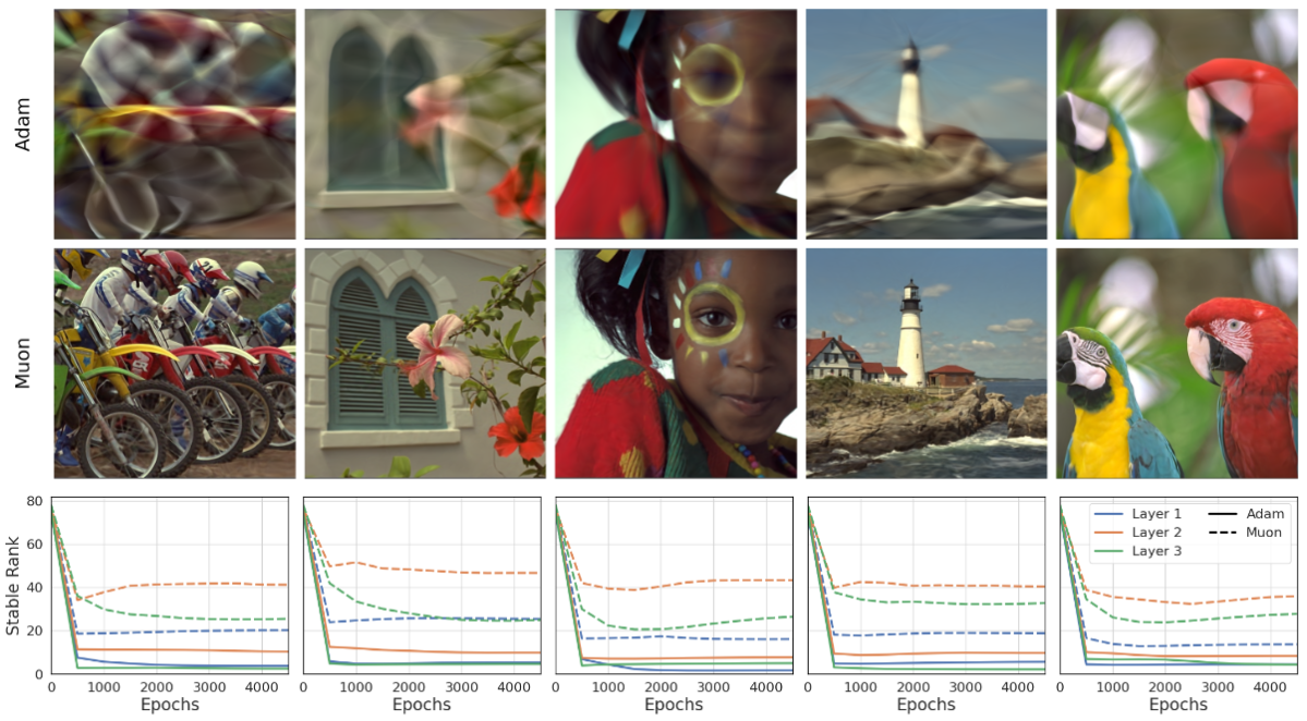 Extensive experiments show that using optimizers like Muon, with high-rank, near-orthogonal updates, con- sistently enhances INR architectures even beyond simple ReLU MLPs. These substantial improvements hold across a diverse range of domains, including natural and medical images, and novel view synthesis, with up to 9 dB PSNR improvements over the previous state-of-the-art.